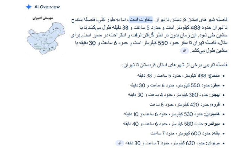 فاصله شهرستان های استان کردستان تا مرکز استان (سنندج)